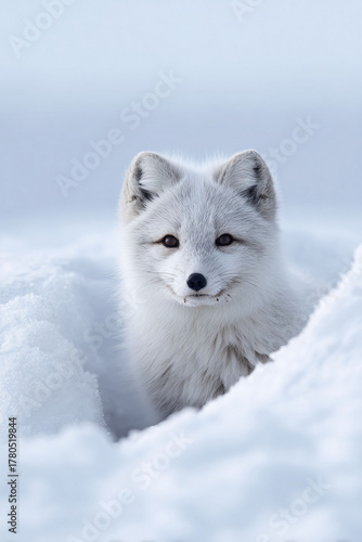 Fototapeta premium Striking portrait of an arctic fox emerging from snowdrift. Evokes themes of winter, survival, resilience, and the beauty of wild nature. Perfect for wildlife, nature, or conservation content.