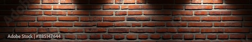 © ki, Obraz premium Striking red brick wall illuminated by dramatic lighting effects, showcasing intricate textures and vivid colors in a high-definition panoramic composition.