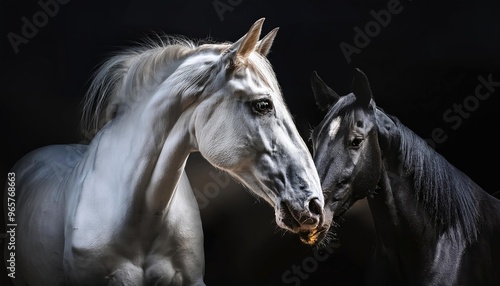 © Rahmat , Fototapeta premium striking scene of a white horse standing prominently in the foreground, surrounded by a group of black horses. The background is shrouded in mist, creating a dramatic atmosphere.