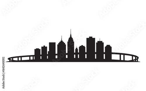 Naklejka premium Striking Silhouette of a Modern Metropolis An Urban Landscape Defined by Towering Skyscrapers and an Elevated Bridge Connecting City Sections
