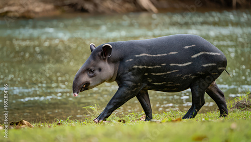 Fototapeta premium Striking South American Tapir Walking Near Water's Edge A Glimpse into the...