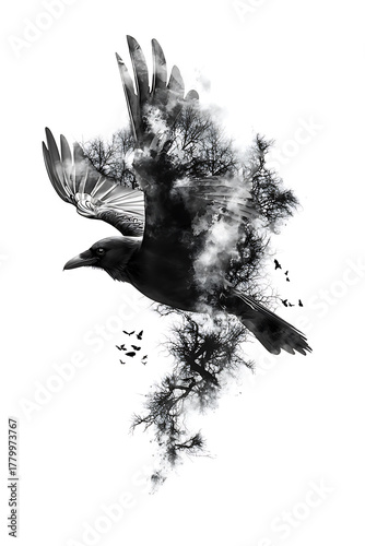 © นิโลบล ชํานาญธรรม, Fototapeta premium Striking tattoo design featuring raven in flight, surrounded by swirling clouds and trees, evoking sense of freedom and mystery