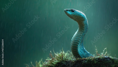 © mahir, Fototapeta premium Striking turquoise snake in a rainforest setting during rainfall.