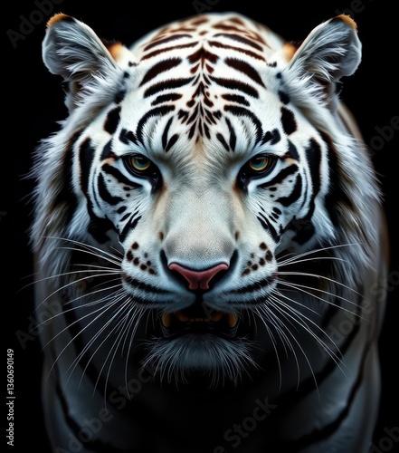 © Katherina, Fototapeta premium Striking white tiger, intense gaze, black background, nature, portrait