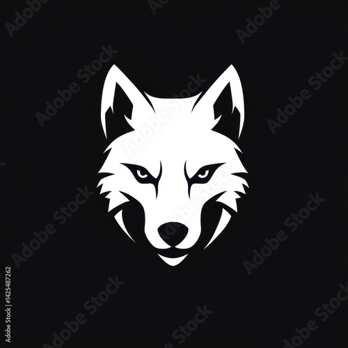 © Yana, Naklejka premium Striking White Wolf Head Logo on Black Background: Minimalist, Bold, and Powerful Animal Symbol