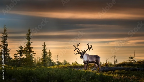 Naklejka premium Striking Woodland Caribou Roaming in a Nature Preserve, Capturing the Purity and Tranquility of Canadas Wilderness at Dusk