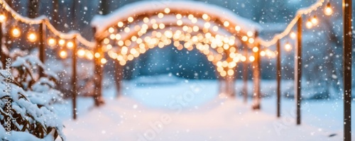 Fototapeta premium String lights wrapped around a snow-covered garden archway, creating holiday...