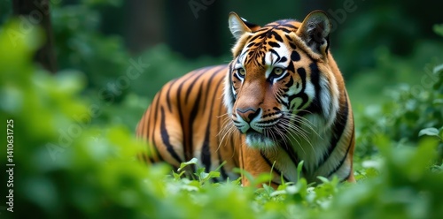 Fototapeta premium Striped Bengal tiger camouflaged by lush green foliage , background, mammal