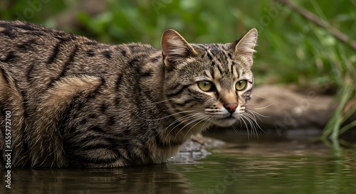 © OmRioRio, Fototapeta premium Striped Cat Drinking Water in Nature