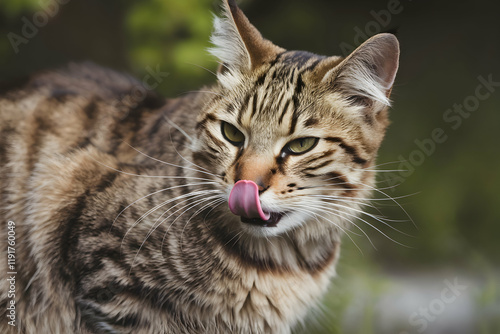 Naklejka premium Striped cat licking whiskers outdoors against blurred greenery in playful moment