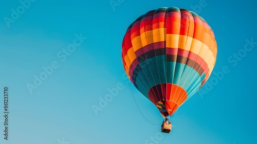© virza, Naklejka premium Striped colors hot air balloon flying on blue sky.