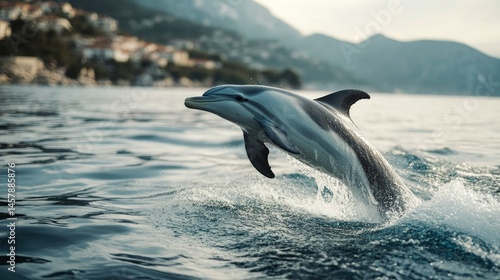 © ACE STEEL D, Fototapeta premium Striped Dolphin Leaping from the Ocean near Coastal Town