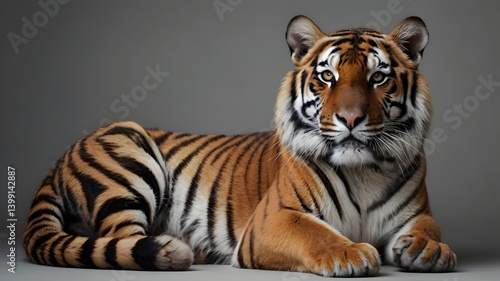 © Onisevens, Obraz premium Striped feline portrait: Relaxed tiger gazing, studio lighting.