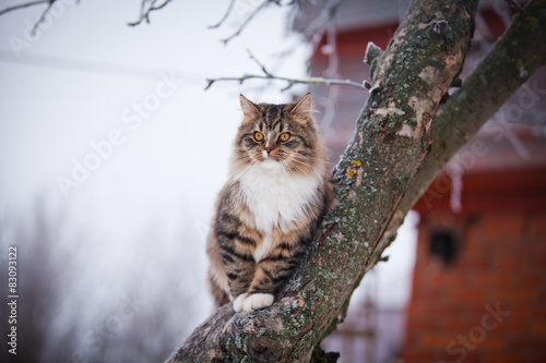 © Anna Averianova, Fototapeta premium Striped fluffy cat on a winter walk