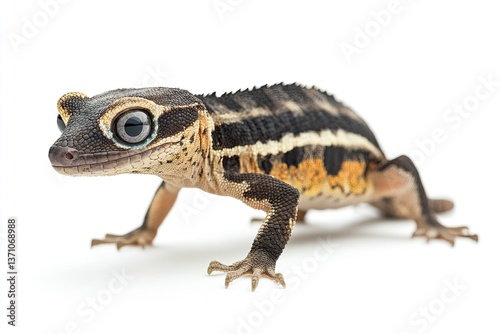 © AYESKIA, Obraz premium Striped Gecko Standing on White Background in Studio Lighting Isolated Shot