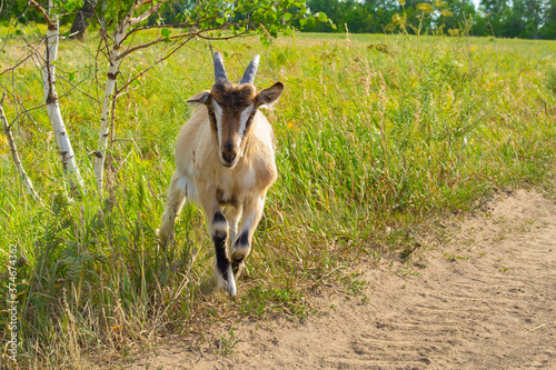 © Kler, Naklejka premium Striped kid in a field near a birch tree