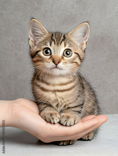 © Nadiyah, Obraz premium Striped kitten perched on a hand against a soft backdrop, in a studio setting