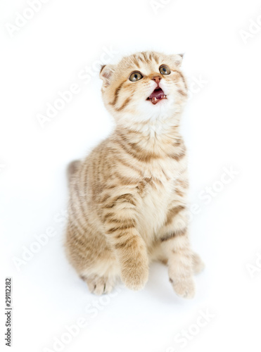Obraz premium Striped Scottish kitten fold pure breed asking for food isolated
