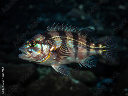© Hafsa, Fototapeta premium Striped Seabass Underwater Closeup Photograph Showing Detailed Fins and Scales