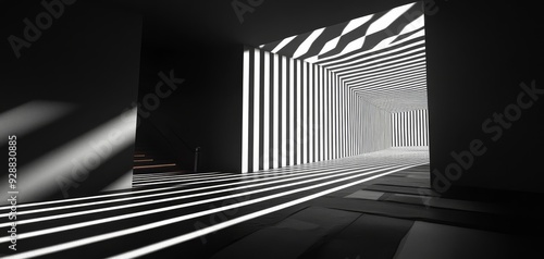 © Kittipong, Obraz premium Striped Shadows A lowangle perspective of a dark corridor with a receding pattern of vertical stripes creating a mesmerizing optical illusion