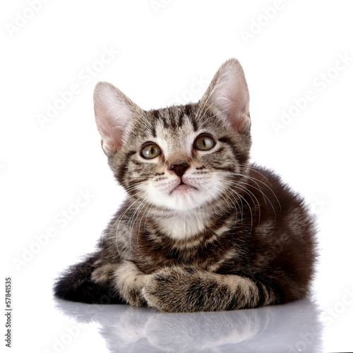 Fototapeta premium Striped Small kitten lies on a white background.