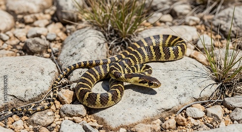 © Jono, Naklejka premium Striped snake on rocks outdoors.