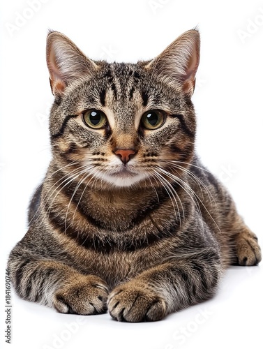 © Dece Std, Fototapeta premium Striped tabby cat with yellow eyes, centered against a white background