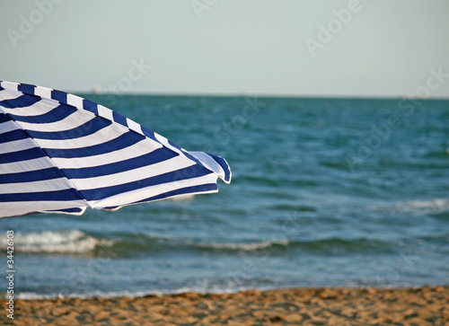 © ChiccoDodiFC, Obraz premium striped umbrella on the beach and sea in the background