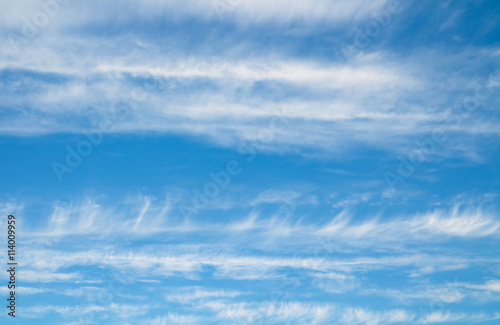 Fototapeta premium Striped white clouds and blue sky. Cloudscape over horizon.