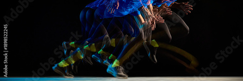 © master1305, Obraz premium Stroboscopic runner motion with layered movement on dark background. Concept of speed, acceleration, dynamic energy, athletic performance, time sequence, and human motion visualization. Banner