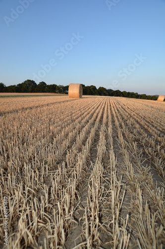 Fototapeta premium Strohballen im Sonnenuntergang, Gerstenfeld Groß Stresow auf Rügen