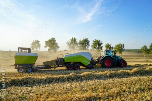 Obraz premium Strohernte mit Ballenpresse und Strohballenstapler