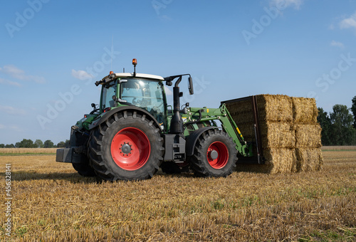 © Countrypixel, Obraz premium Strohernte - Traktor mit Frontlader beim Beladen eines Transportanhängers mit Strohballen.