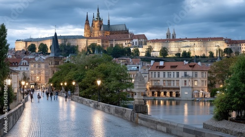 Fototapeta premium Strollers enjoy a quiet evening on the bridge overlooking the city under a...