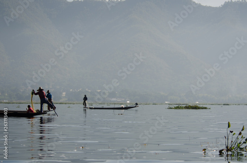 Naklejka premium Strolling by boat in Inle Lake, Myanmar.