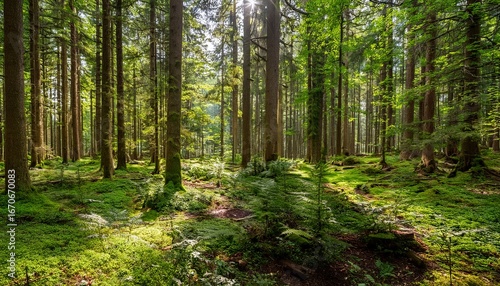 Obraz premium strolling through a lush forest filled with tall trees and vibrant greenery while sunlight creates beautiful patterns on the forest floor
