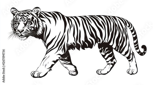 Naklejka premium Strolling Tiger on White. Wildlife, conservation, animal, educational, arts & crafts