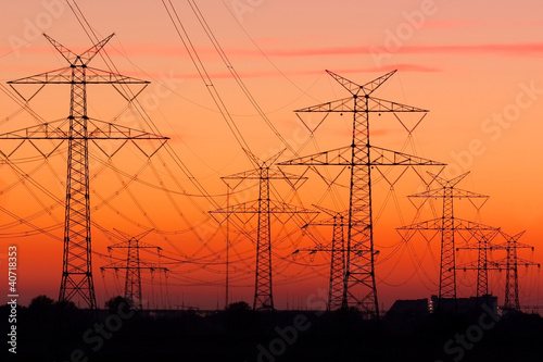 Fototapeta premium Strommasten bei Sonnenuntergang, Electricity pylons