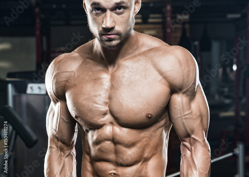 Fototapeta premium strong and handsome young man doing exercise with dumbbells