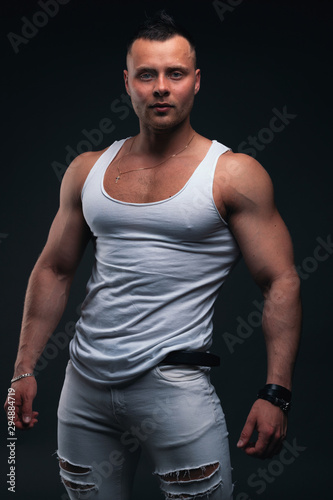 Fototapeta premium Strong and handsome young man with muscles and biceps. Studio shooting on...
