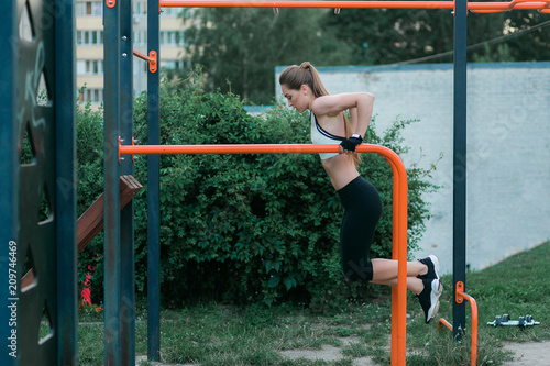 Fototapeta premium Strong and physically fit young woman doing triceps dips on parallel bars at...