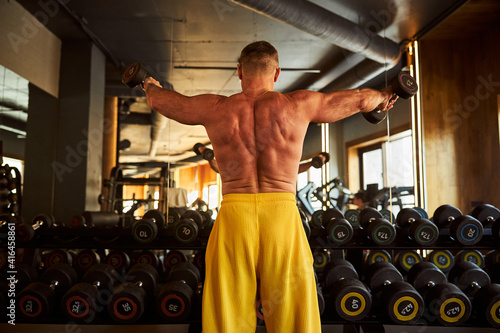 Fototapeta premium Strong athletic gentleman with bare torso lifting dumbbells