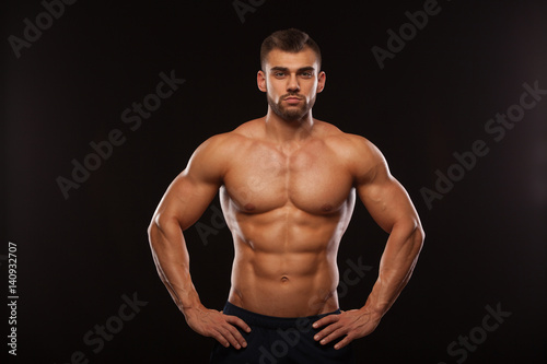 © satyrenko, Fototapeta premium Strong Athletic Man - Fitness Model showing his Torso with six pack abs. isolated on black background with copyspace