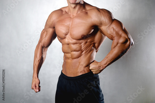Fototapeta premium Strong athletic man fitness model showing six pack abs