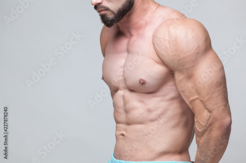 © satyrenko, Fototapeta premium Strong Athletic Man Fitness Model Torso showing six pack abs. isolated on grey background with copyspace