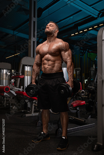 © Vitalii But, Naklejka premium Strong athletic man is executing deadlifts in well equipped gym setting during evening workout. His focused expression highlights dedication fitness and strength training.