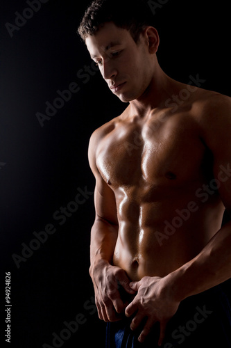 © fotofabrika, Fototapeta premium Strong athletic man on black background