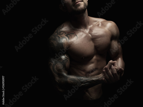 © Prostock-studio, Fototapeta premium Strong athletic man showes naked muscular body