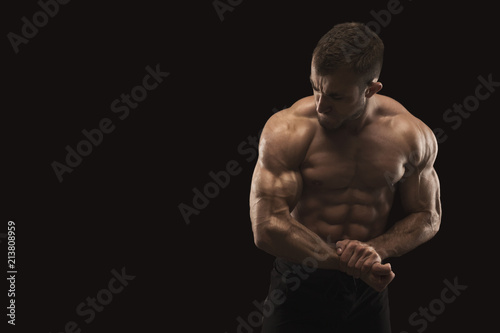 © Prostock-studio, Naklejka premium Strong athletic man showes naked muscular body