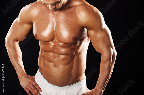Fototapeta premium Strong Athletic Man showing muscular body over black background.Muscular man...